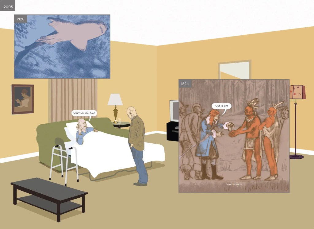 My hope is there’s something in there for everyone. Daybreak (2023) is a collaborative board game like Pandemic (they share a co-creator). As with any complex game, it takes a bit of rule-reading and working through. But it perfectly captures the give and take of international co-operation on climate. I was lucky enough to playtest a card version of the game with the help of creator Matteo Menapace—he’s great. Meanwhile, Here (2014) is a stunning graphic novel that represents change over time in a way that’s unique to the medium.